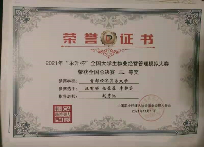 2021年11月13日,由中国职业经理人协会指导,中国职业经理人协会物业经理人分会主办,武汉科技大学恒大管理学院、北京现代中欧软件开发有限公司联合承办,旭辉永升服务集团有限公司冠名支持的2021年“永升杯”全国大学生物业经营管理模拟大赛总决赛成功举办。
