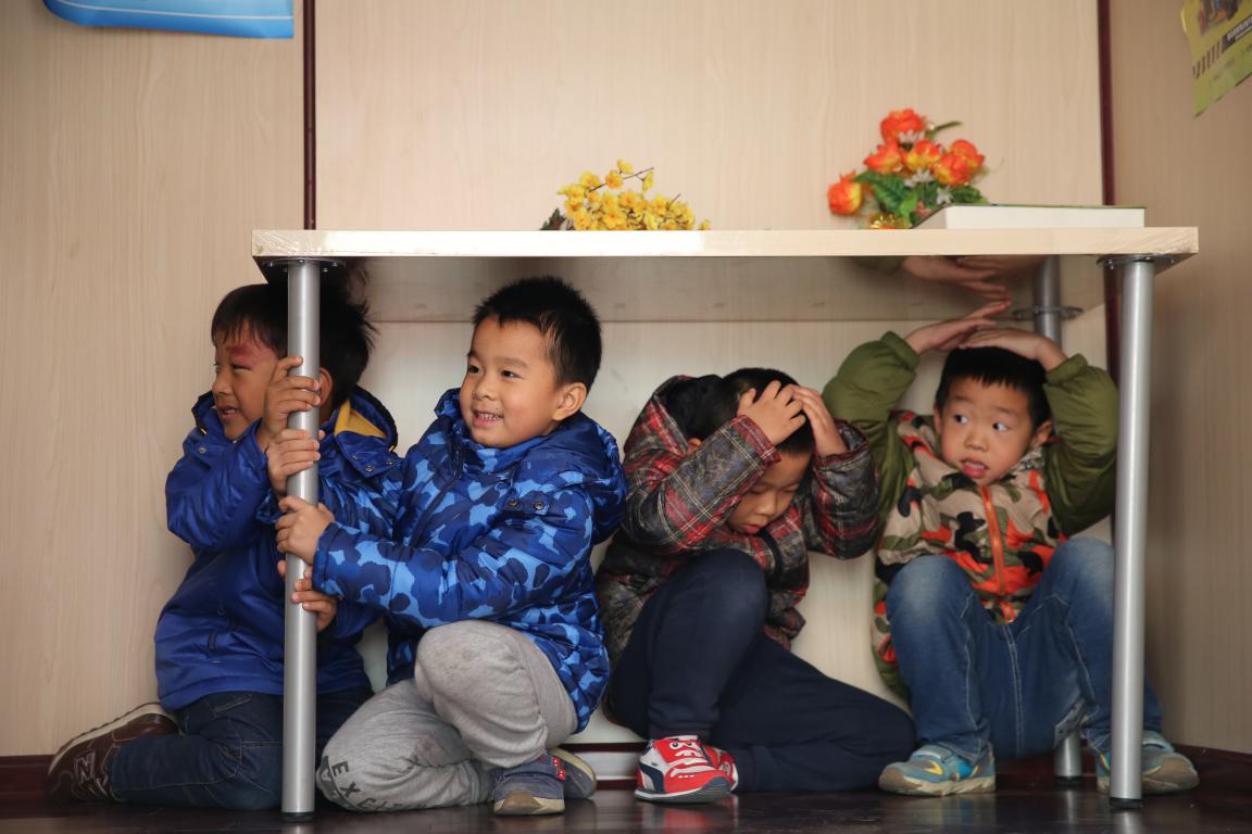 小朋友们正在体验地震车模拟实验,亲身实践所学到的地震自救知识。