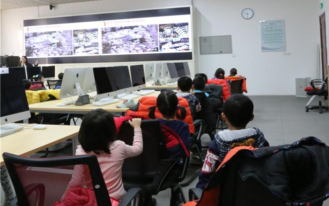 首先,幼儿园的小朋友们在幼儿园老师们的带领下来到实验室。陆辉老师展示了实验室的互动沙盘危机体验系统,小朋友们被沙盘模型深深地吸引。