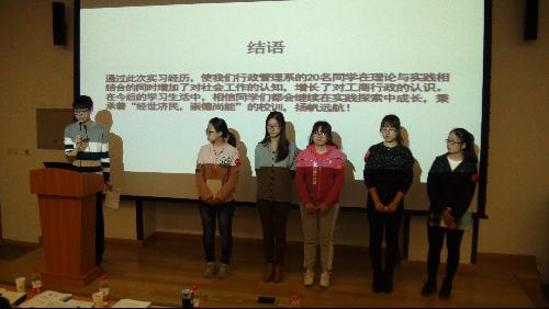 实习实践个人汇报环节,13、14、15级行政管理、公共事业管理、土地资源管理、城市管理等年级的实习同学代表或团队,共13组、21位同学分别发言,图文并茂地介绍了自己的实习实践过程和经验体会。