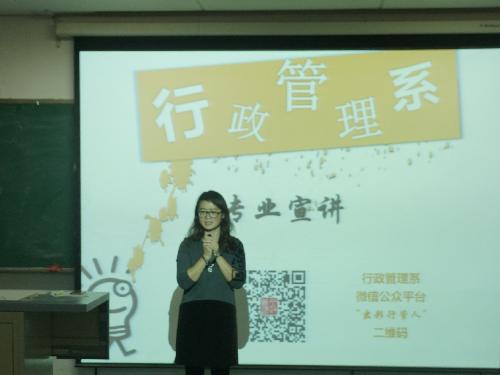 接着,在校生代表畅谈了自己就读行政管理专业的感受。她详细介绍了行政管理系的课程设置,大致分为基础课、专业课以及选修课三个部分,阐明了各门课程的设置目的,并对部分科目发表了个人见解,向学弟学妹传授了许多宝贵的经验。