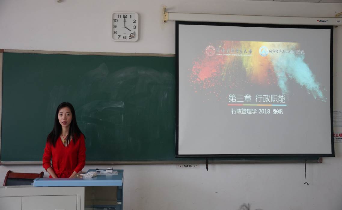 学院各系均派出青年教师参赛,行政管理系黄衔鸣、陈曦、张帆,公共事业管理系姜金秋,土地资源管理系张杨、王建强,城市经济管理系闫觅、颜燕,区域经济系李青淼等9位青教,经抽签后决定次序,同台讲课。