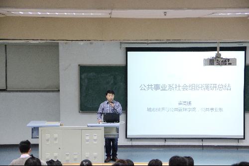 首先,公共事业专业崔高鹏老师上台宣讲。所谓术业有专攻,崔老师主要从事教育事业方面的公事管理。崔老师在台上就2015-2016学年公共事业专业所组织的”济南调研社会组织”-“ISD(爱山东)公益创新空间”及参与”踏瑞杯”社会工作多媒体案例开发大赛决赛暨颁奖仪式协同开展的”南京考察学习”活动做了展示。既体现了该专业的社会性,也体现了该专业的实践性,同时还丰富了参加这些活动的15级学生们的对社会公共事业的认知