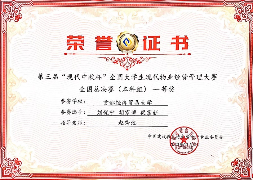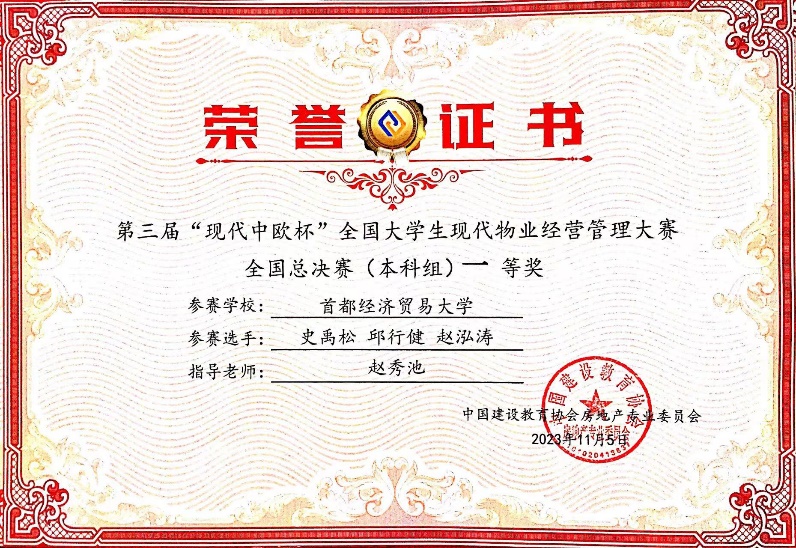 2023年11月4日,第三届“现代中欧杯全国大学生现代物业经营管理大赛”全国总决赛在广东建设职业技术学院清远校区举行。大赛由中国建设教育协会指导、中国建设教育协会房地产专业委员会主办、广东建设职业技术学院和北京现代中欧软件开发有限公司联合承办。全国50所高校109支队伍参加了全国总决赛。比赛全程在计算机上模拟开展,本次大赛秉承“以赛促学、以赛促教、以赛促改、以赛促建”的宗旨,希望通过大赛提高大学生现代物业经营管理能力,培养高素质的物业管理人才,激发大学生的专业兴趣,提高大学生的实践能力,推动我国物业管理行业发展。经过激烈角逐,学院团队获得2个全国一等奖、1个二等奖,赵秀池教授获得了优秀指导教师。