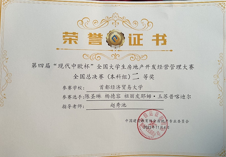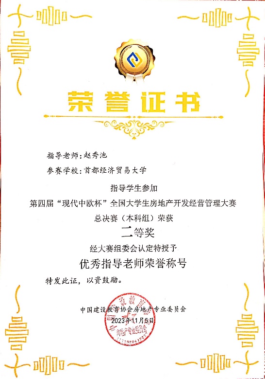 2023年11月5日,“第四届现代中欧杯全国大学生房地产开发经营管理大赛”全国总决赛在广东建设职业技术学院清远校区举办。本次大赛由中国建设教育协会指导、中国建设教育协会房地产专业委员会主办、广东建院和北京现代中欧软件开发有限公司联合承办。大赛坚持以赛促学、以赛促教、以赛促改、以赛促建,旨在提高大学生的房地产经营和管理能力,推动房地产行业的改革发展和技术进步,为房地产企业培养和发现高素质、高技能人才。本次大赛共有34高校、76支队伍到现场参加了总决赛,全程采取计算机网上比赛。我院3个团队均获得了全国二等奖,赵秀池教授获得了优秀指导教师称号。