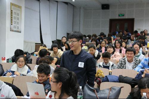 接下来,来自北京大学政府管理学院的两位“院友”发言。第一位是已经保研北大城市经济专业的14级城市管理专业的杨浩天同学,第二位是元培班本科毕业直接保研的17级城市经济研究生雷渌瑨同学。二位同学把自己对城市发展以及对城市经济专业的理解向同学们做了精彩的讲解,使同学们更加了解了城市经济专业的未来光辉发展前景。