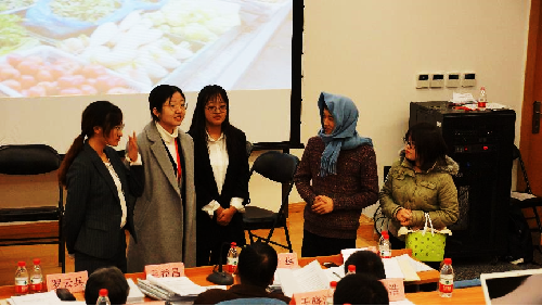 第八届全国高校“模拟市长”大赛首经贸校内赛主要分为三个环节。第一个环节是“锋芒初露”,十支队伍依次上台通过视频向评委及观众介绍团队成员及所研究的问题。第二个环节是“唇枪舌剑”,八支团队采用PPT展示、圆桌会议、情景模拟、视频等多种形式展示了团队的研究内容、过程和成果,并接受了评委们的现场提问。第三个环节为“市长终极PK”,这一环节是请评委出题,每一队的“市长”作答。“市长”在两分钟内将答案写在答题板上并做阐释。通过这种方式考察每个“市长”的临场应变能力、决策能力和专业素养。嘉宾和观众们不时为“市长”们的精彩表现报以热烈的掌声。