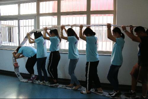 随后同学们选出了各队队长和模特进行“星光大道”游戏,大家积极热情,在规定时间内完成了指定主题的报纸裁衣任务,并想出队名、队旗、口号、队歌。时间结束后各组分别对他们的创意进行展示、讲解、比拼。同学们的分工意识和创新动手能力得到了充分锻炼,也让他们互相更加了解。