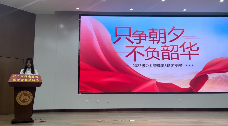 “青年力量”单元紧扣“青年是整个社会力量中最积极、最有生气的力量”,展演团支部依次是2023级公共管理类6班团支部、3班团支部和1班团支部。2023级公共管理类6班团支部以北京红色资源为依托,介绍了支部团员青年走进中国人民革命军事博物馆、中国人民抗日战争纪念馆、卢沟桥和北大红楼开展的“传承红色基因,坚定奋进信心”系列主题团日活动。2023级公共管理类3班团支部委员分别结合自身工作,围绕学习贯彻习近平总书记关于青年工作的重要思想分享了学习感悟。2023级公共管理类1班团支部将“弘青年之声,展华夏之魂”主题团日活动搬上舞台,进行了一场跨越一百零五年在错位时空下的对话,许下新时代的青春誓言。