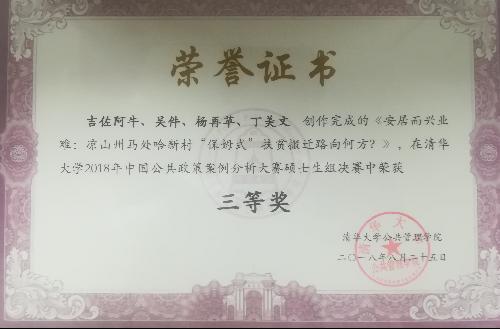 近日,由漫画人 教师团队指导,行政管理专业硕士研究生吴件作为核心成员的“智叟搬迁队”代表队,历时近半年,调研并创作完成的公共政策分析报告,从海内外90所高校的151支硕士生队伍中脱颖而出,取得了清华大学2018年中国公共政策案例分析大赛硕士生组决赛三等奖(总排名第4)的优异成绩。其中,中国科学院大学等高校组队获得一等奖,中国人民大学和四川大学等高校组队获得二等奖。 图1 获奖证书 该团队由漫画人 、西南大学、四川大学、南开大学各1名硕士生组成,案例分析报...